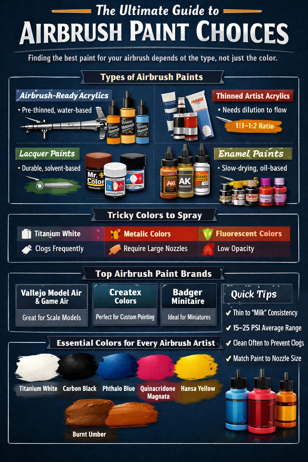 Si desea una respuesta directa y sin desvíos... Las pinturas acrílicas listas para usar con aerógrafo son la mejor opción para la mayoría de los usuarios de aerógrafo. , ya sea que esté pintando modelos a escala, zapatillas deportivas personalizadas, decoración de pasteles, pintura corporal o lienzos artísticos. Son a base de agua, no tóxicos, de secado rápido y formulados con partículas de pigmento lo suficientemente finas como para fluir a través de las boquillas del aerógrafo sin obstruirse. Marcas como Vallejo, Createx y Badger Minitaire lideran esta categoría por una buena razón.