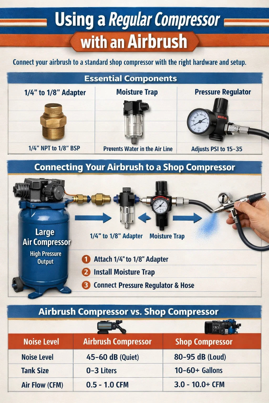 tu Absolutamente puedo hacer funcionar un aerógrafo usando un compresor normal de taller o garaje. , siempre que tenga los adaptadores correctos y una forma de regular la presión. Si bien los compresores de aerógrafo dedicados están diseñados para un funcionamiento silencioso y de baja presión, un compresor estándar de gran escala es más que capaz de proporcionar el flujo de aire necesario. De hecho, muchos pintores profesionales prefieren los compresores normales porque su Los grandes tanques de almacenamiento proporcionan un flujo de aire perfectamente estable y sin pulsos. que los modelos pequeños de aerógrafos sin tanque a menudo tienen dificultades para igualar.