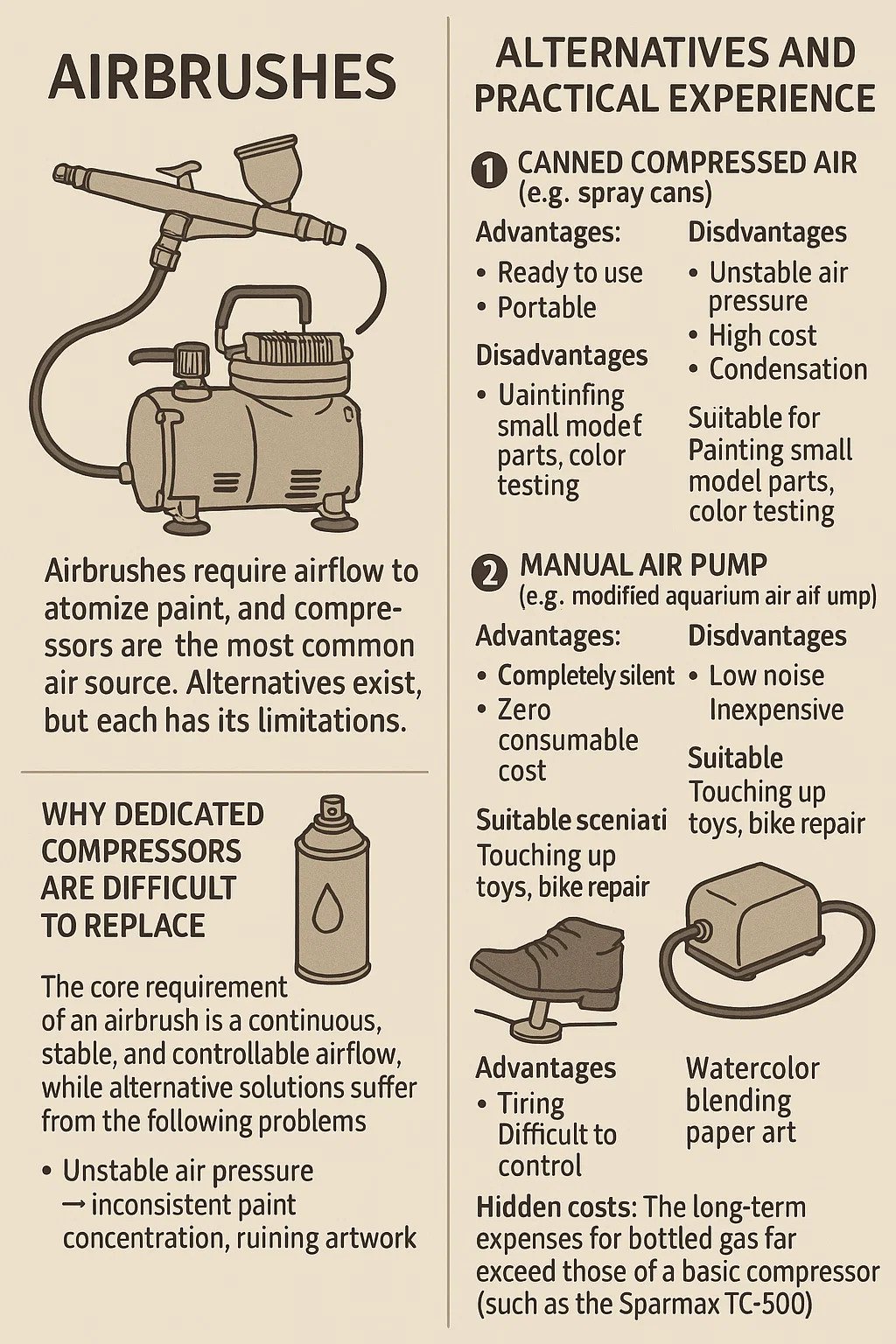 Aerógrafos requieren flujo de aire para atomizar la pintura y los compresores son la fuente de aire más común. Existen alternativas, pero cada una tiene sus limitaciones.