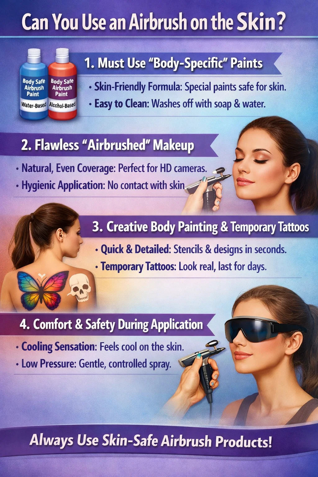Usando un aerógrafo sobre la piel no sólo logra un nivel de detalle inigualable si se aplica a mano, sino que también crea efectos visuales increíblemente realistas. Sin embargo, debido a que la piel es parte del cuerpo humano, existen algunas consideraciones muy importantes: