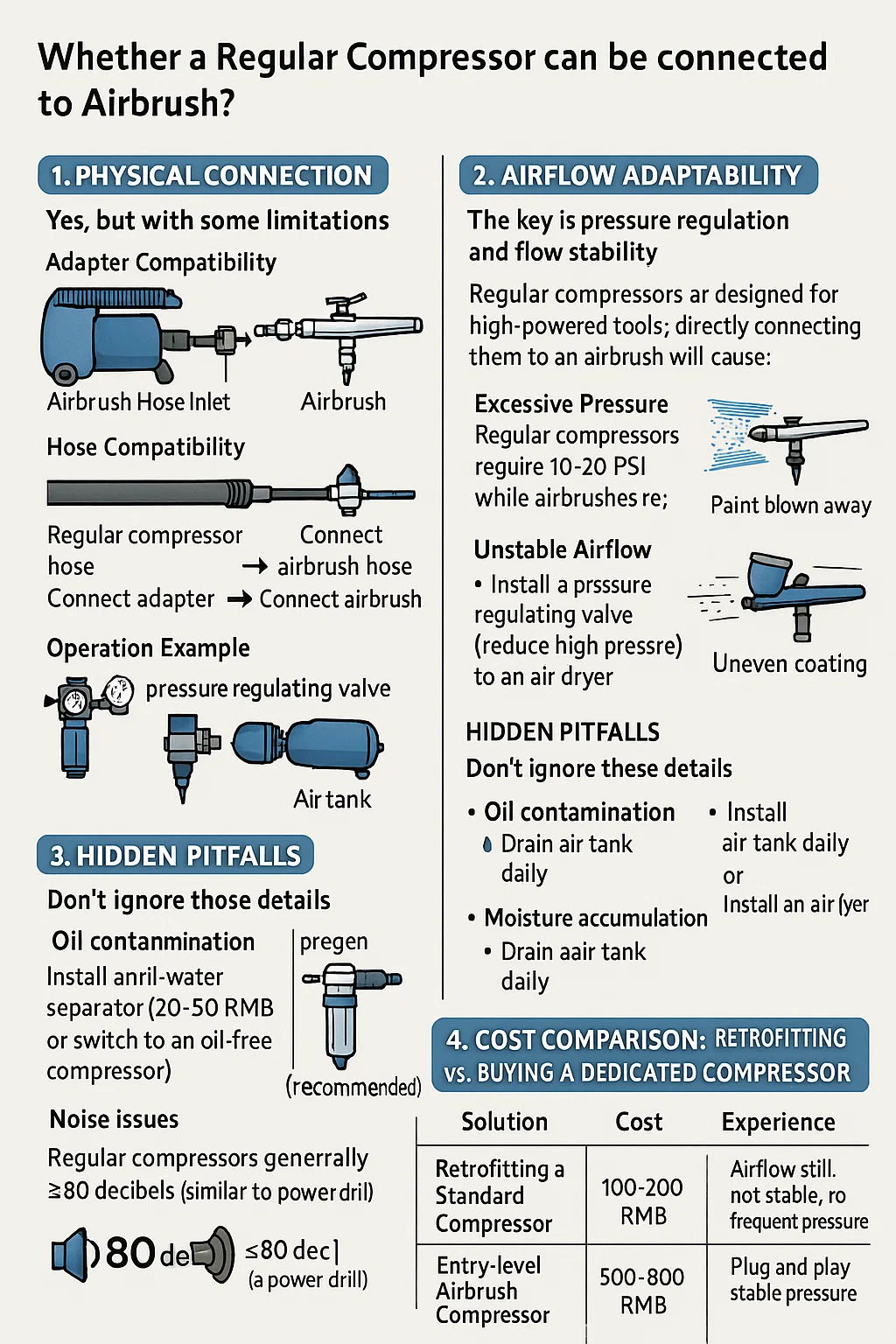 Los compresores normales están diseñados para herramientas de alta potencia; conectarlos directamente a un aerógrafo causará problemas: