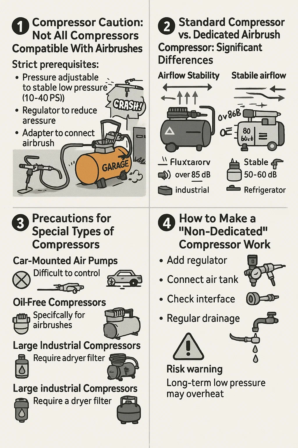 Compresores sin aceite: los compresores específicos para aerógrafos en su mayoría no contienen aceite para evitar que el aceite se mezcle con la pintura; Los compresores comunes que utilizan aceite lubricante pueden contaminar el canal del aerógrafo.
