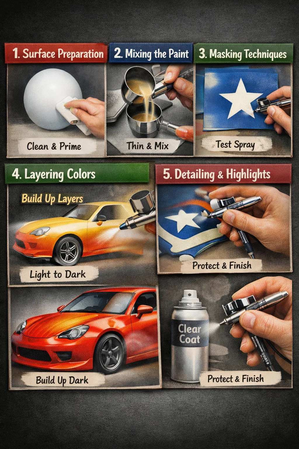 Estos son los pasos principales para completar un aerógrafo pintura: